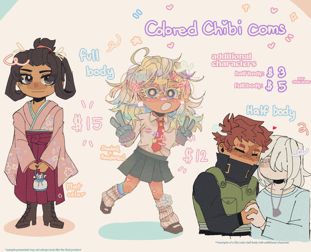 *this can be negotiated, but keep in mind i prefer doing simple backrounds (this will be an additional $10-20, it can depend), but i might consider if there is a clear reference